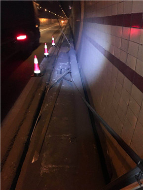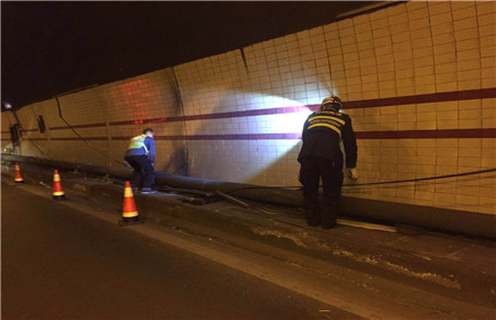 此時(shí)此刻,維養(yǎng)中心值班同志已經(jīng)馬不停蹄地奔往現(xiàn)場,中心負(fù)責(zé)人從臨海速度趕往現(xiàn)場。經(jīng)檢查,掛落電纜系汽通門控制線,不影響隧道內(nèi)照明、通訊系統(tǒng)的正常運(yùn)行。當(dāng)機(jī)立斷,決定采取臨時(shí)加固的緊急措施,及時(shí)聯(lián)系協(xié)調(diào)交警部門,請(qǐng)求封道施工的幫助和支持。