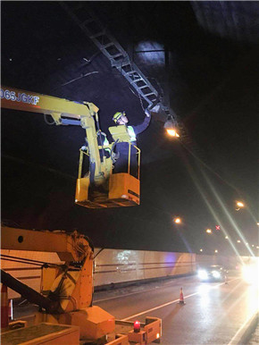 圖為施工人員維修電纜 當(dāng)天早上8時(shí)左右,交警開始組織實(shí)施封道搶修。作業(yè)期間,大溪嶺隧道所堅(jiān)守在北洞口卡口預(yù)警,維養(yǎng)中心班員和專業(yè)搶修人員對(duì)橋架、掛落的電纜和被撞的攝像頭進(jìn)行了應(yīng)急處理與臨時(shí)加固。此時(shí),過往車輛已堵到大溪收費(fèi)所,這時(shí)候,時(shí)間就是速度,速度就是通車效率。