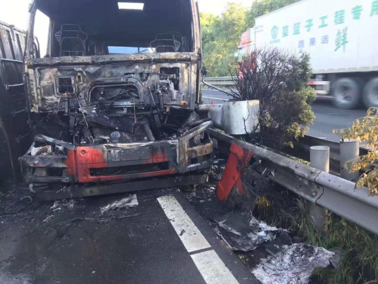 大火在現(xiàn)場留下了幾乎成為殘骸的兩輛車、滿地的油污、車輛碎片、燒剩下的布匹,一股刺鼻的臭味一公里外都聞得到。油污讓路道變得又膩又滑。更為嚴重的是,隨著時間的推移,從事故點開始,堵車開始一公里一公里的蔓延,幾乎快到了臺州收費所。