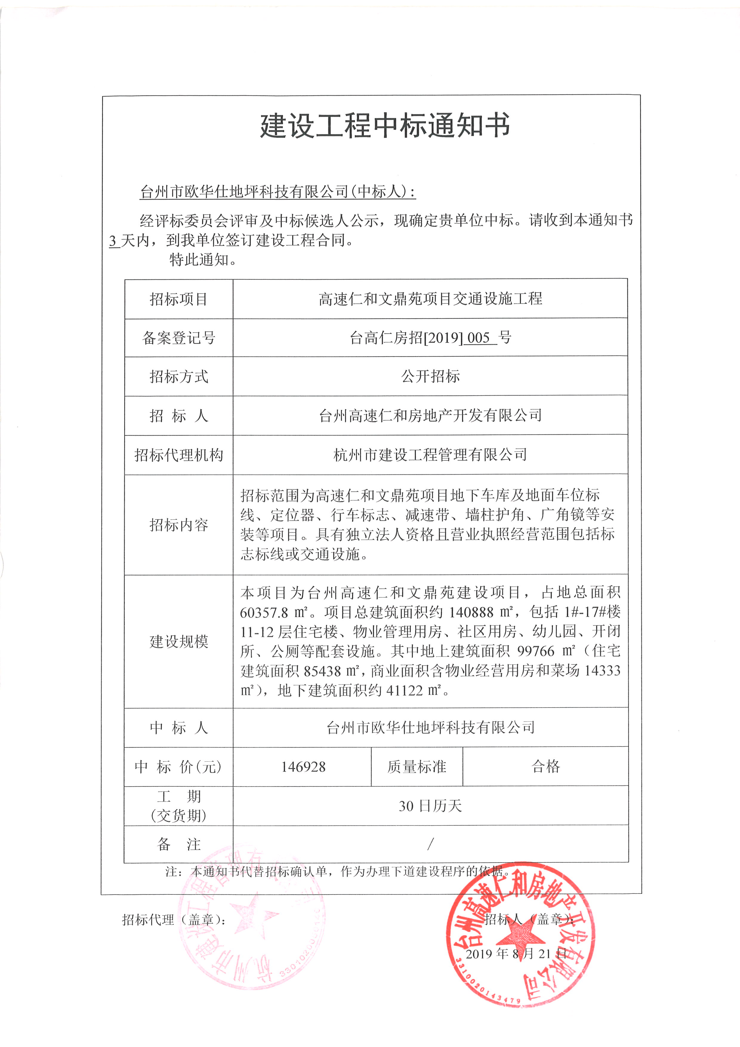 高速仁和文鼎苑項(xiàng)目交通設(shè)施工程中標(biāo)通知書(shū)