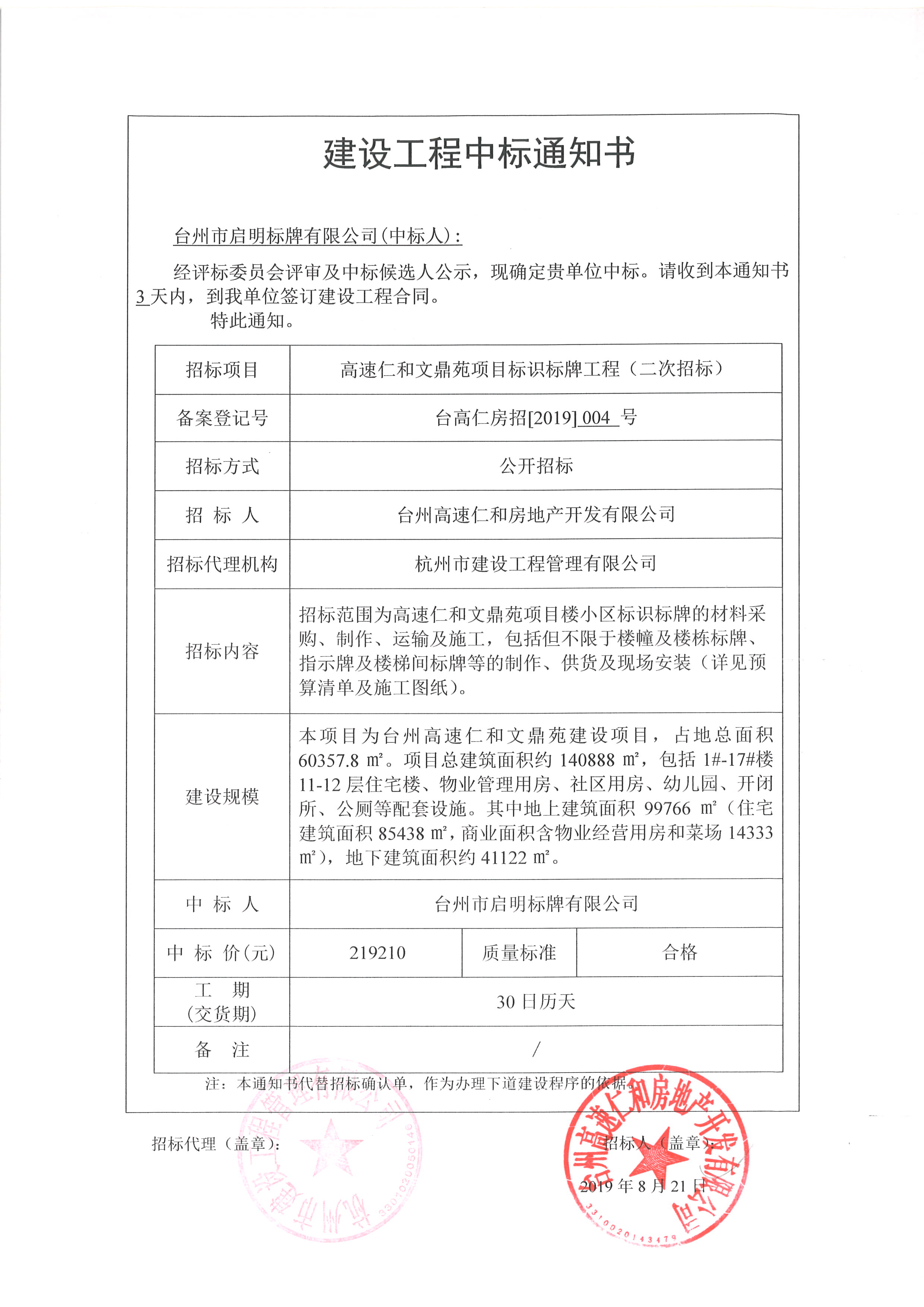 高速仁和文鼎苑項(xiàng)目標(biāo)識(shí)標(biāo)牌工程中標(biāo)通知書(shū)