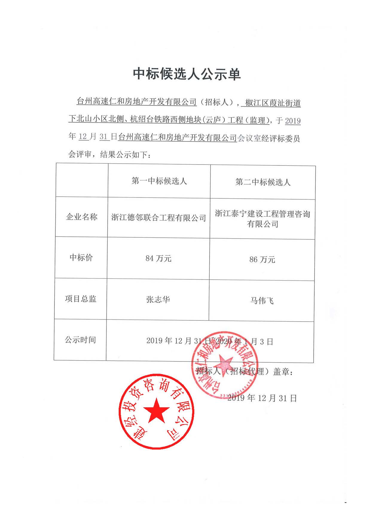 椒江區(qū)葭沚街道下北山小區(qū)北側(cè)、杭紹臺(tái)鐵路西側(cè)地塊(云廬)工程(監(jiān)理)中標(biāo)候選人公示單