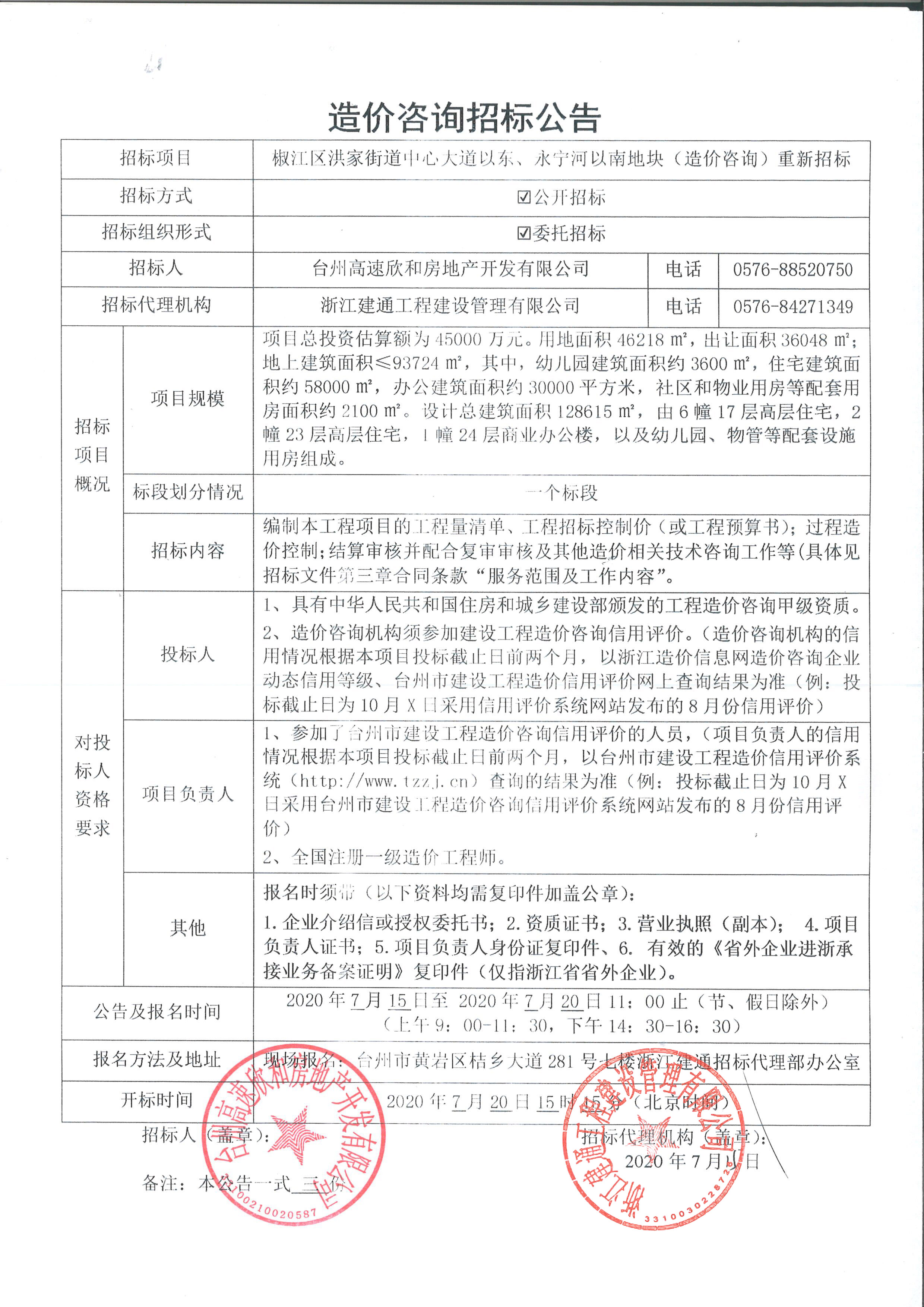 椒江區(qū)洪家街道中心大道以東、永寧河以南地塊(造價(jià)咨詢)重新招標(biāo)公告