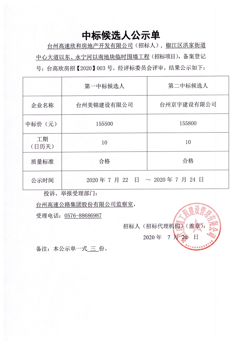 椒江區(qū)洪家街道中心大道以東、永寧河以南地塊臨時圍墻工程(招標項目)中標候選人公示單