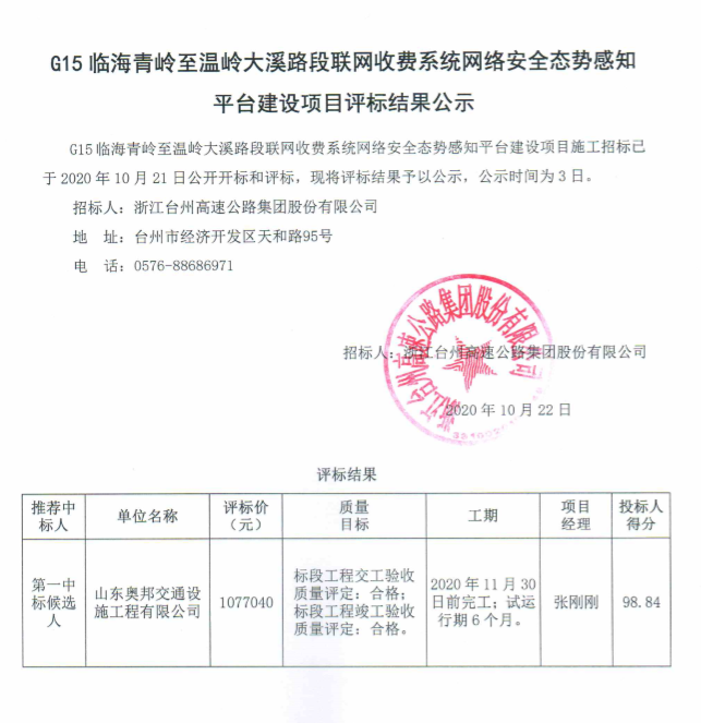 G15臨海青嶺至溫嶺大溪路段聯(lián)網(wǎng)收費系統(tǒng)網(wǎng)絡(luò)安全態(tài)勢感知平臺建設(shè)項目評標結(jié)果公示