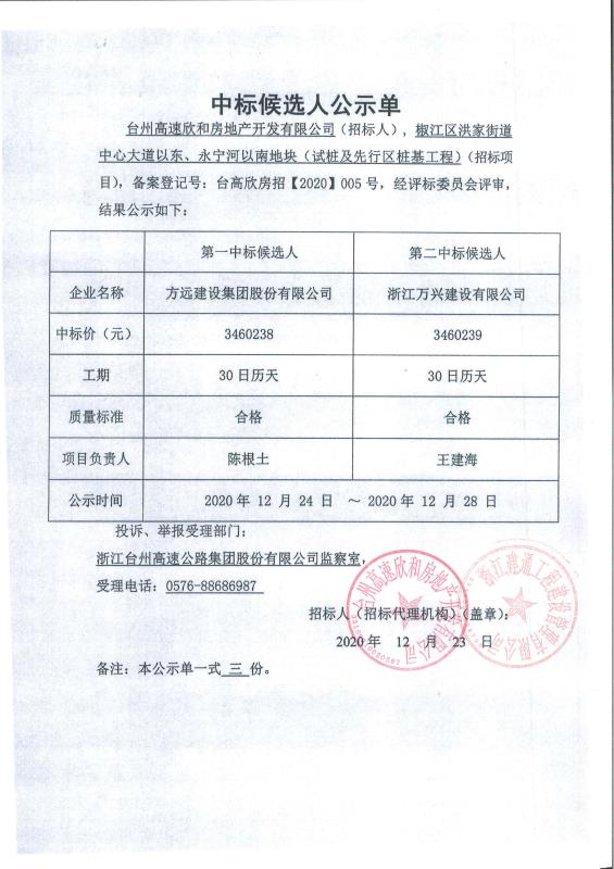 椒江區(qū)洪家街道中心大道以東、永寧河以南地塊(試樁及先行區(qū)樁基工程)中標候選人公示單
