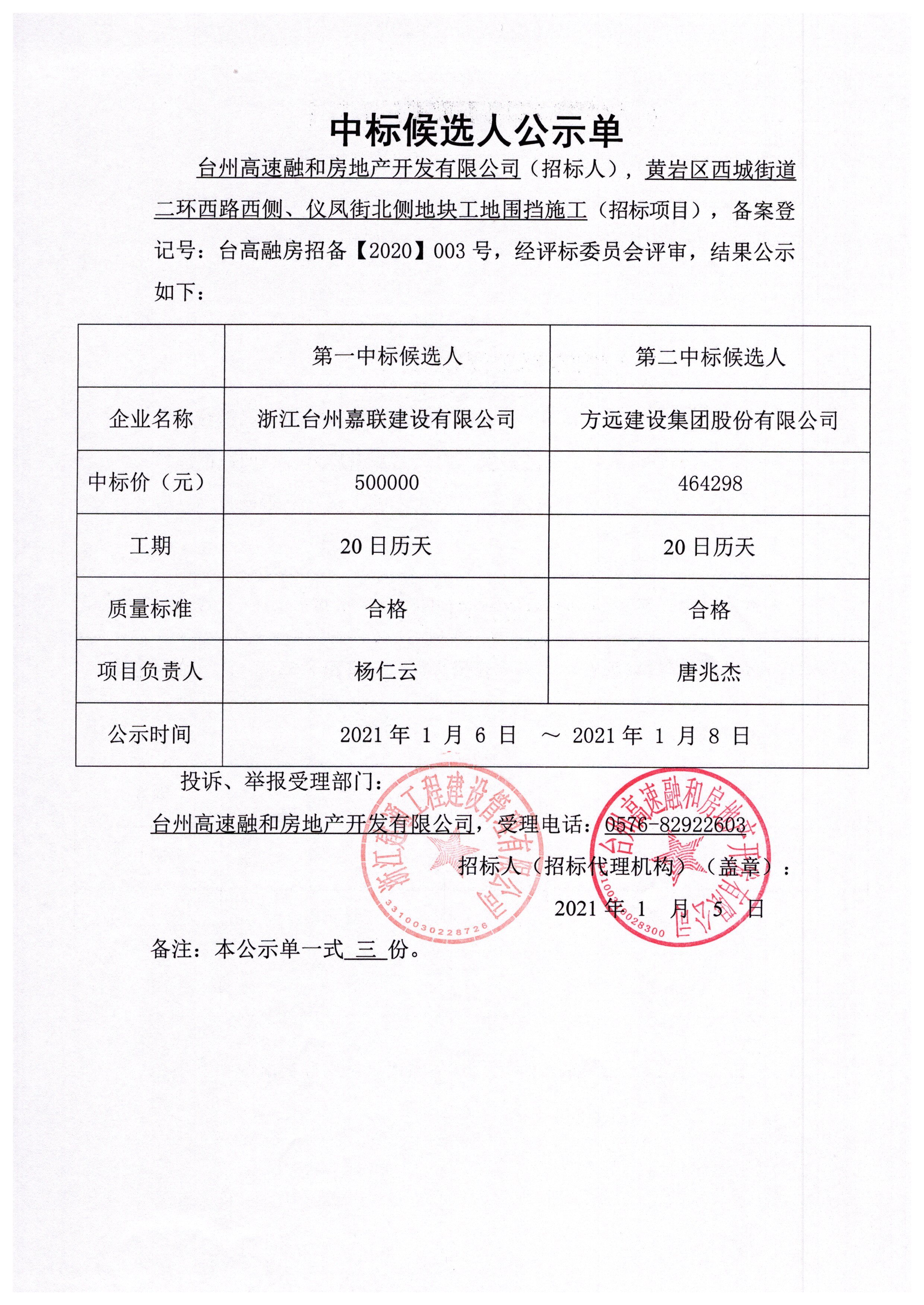 黃巖區(qū)西城街道二環(huán)西路西側、儀鳳街北側地塊工地圍擋施工中標候選人公示單