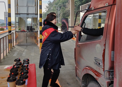 活動當(dāng)天,雖然氣溫較低,但是在臨海南收費所入口處,身著紅色綬的志愿者們依然熱情地為過往司乘人員遞一杯杯滾燙的姜茶,并過往大貨駕駛員發(fā)放優(yōu)惠政策宣傳單。