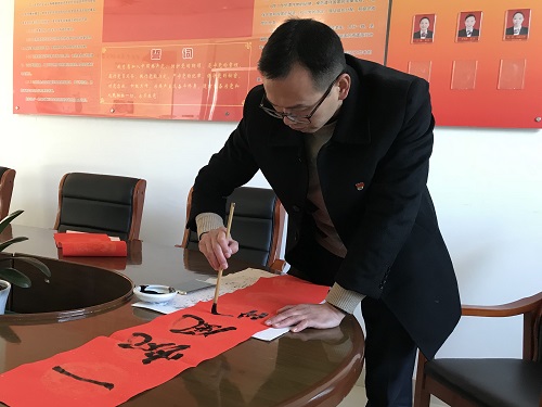 上聯(lián)“自強(qiáng)不息吉慶到”、下聯(lián)“厚德載物福運(yùn)來”,橫批“喜迎新春”,個(gè)個(gè)遒勁有力的大字從筆尖輕快地躍出,行云流水的書法讓在場(chǎng)人員無不拍手叫好。所長孫明偉亮出絕活,揮毫潑墨,豪邁大氣地?fù)]寫著一幅幅春聯(lián)。