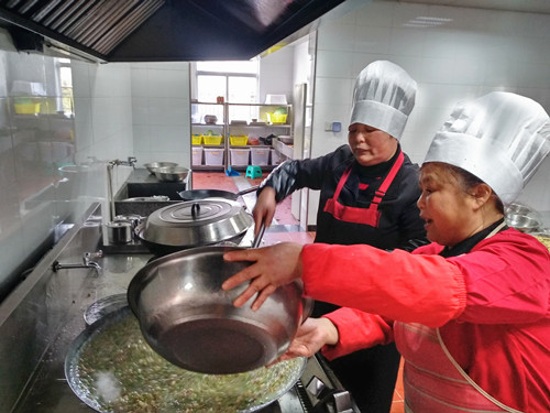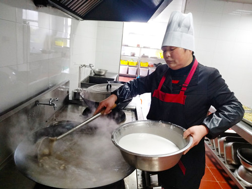 浸了一夜的早米,用石磨磨成米漿,細(xì)膩而幼滑,被靜置在盆里?!耙话愣加妹追叟菟诟写植?,而且吃起來(lái)沒(méi)有香頭?!崩ㄒ贿呎f(shuō),一邊將香腸切碎與豆腐、冬筍、胡蘿卜、芹菜、香菇、蠶豆瓣翻炒著。旁邊的大鍋里,長(zhǎng)長(zhǎng)的豆面在骨頭湯里翻滾著,像一棵棵舞蹈的海草。徐徐倒入的米漿,被不停地?cái)嚢瑁耙钦车藉?,就?huì)有焦糊味,這鍋羹就算廢了。”米漿好像不夠,利花有些懊惱,“要是在家里,米漿都會(huì)多準(zhǔn)備一些,不夠就隨手添,我?guī)У竭@里就這些,也沒(méi)得加了?!本徒性谝贿呑鰩褪值拿妹脤毣ㄓ妹娣酆蜕椒郏ㄒ簿褪欠矸郏剿杵饋?lái),倒入鍋里,湯漸漸濃稠起來(lái),倒入之前炒好的配料,加上切得細(xì)細(xì)的綠綠的芥菜梗、芥菜葉、海蠣,鍋里不時(shí)冒起大泡,香氣四溢。 為照顧吃不慣糟羹的同事,食堂還準(zhǔn)備了一鍋甜的山粉糊。來(lái)自臺(tái)州各縣市區(qū)的同事,按各自飲食習(xí)慣選擇了咸的或甜的。有說(shuō)芹菜的味道蓋過(guò)了芥菜清香的,有說(shuō)沒(méi)有加入芋頭口感不夠糊的,但撲鼻的香氣和濃厚豐富的口感立刻讓人忘了挑剔。對(duì)我來(lái)說(shuō),碧綠的芥菜葉和白胖的海蠣肉是整碗羹的顏值擔(dān)當(dāng)和靈魂所在。 每個(gè)元宵節(jié),對(duì)于在崗的同事們是沒(méi)有花燈可看、沒(méi)有燈謎可猜的,也不能與家人聚在一起吃羹。車(chē)道上此刻正是流量高峰期,大家匆匆吃完,都要趕著上崗。食堂大姐把多出的糟羹和山粉糊放進(jìn)蒸飯鍋保溫,叮囑大家下班后再來(lái)吃點(diǎn),這個(gè)吃了不扛餓。此時(shí),除了食物最能體現(xiàn)節(jié)日氣氛外,還有那一份特意為你留著的溫?zé)岣屓烁袆?dòng)。 鄭瑛芝