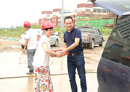 圖為仁和房產(chǎn)董事長羅小將向施工單位代表遞送慰問品