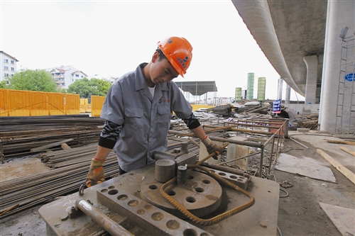 “綁鋼筋也是個技術活?!瘪R進學告訴記者,8#立交工程中,像他這樣的鋼筋工就有100多號人,他們按照設計將鋼筋進行布置和固定,形成建筑的骨架。馬進學熟練地把一組加工好的鋼筋綁扎到結(jié)構(gòu)上,這樣的工序,他一下午能做20多組。