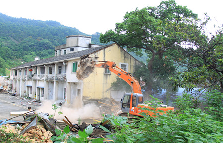 圖為挖掘機(jī)正在拆除軍產(chǎn)房屋